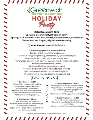 Join the Greenwich Chamber of Commerce for our annual Holiday Party — a festive evening of community, connection, and cheer!
